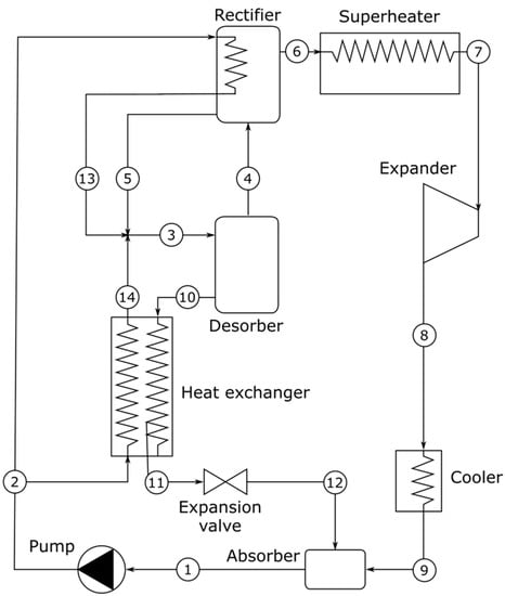 The Kalina cycle can work with any kind of fuel, similarly to the Rankine cycle. Modi et al. [] performed a thermoeconomic optimization of a Kalina cycle for a central receiver concentrating solar plant at a high temperature. Nevertheless, the Kalina cycle proved to be less efficient and with higher LCOE than the state-of-the-art Rankine cycle for nearly all the considered cases. On the other hand, Król and Krajačić [] proposed a Kalina cycle coupled with a biogas Brayton cycle with an efficiency of 28%. Factors influencing the economics of the Kalina power cycle and situations of superior performance may be found in [].