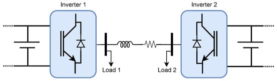 The investigated model in this study is demonstrated in Figure 1, where two inverters are connected by an interconnection line, for which both the inductive and resistive properties are considered. Such inverters are connected to renewable-based generation systems, such as wind turbines or photovoltaic panels. As illustrated in Figure 1 and Figure 2, the inverters are connected to the energy storage systems, which are in turn charged by the energy from the renewable generation sources. The renewable generation systems have their own control systems that are decoupled from the control systems in the inverters, which is why they are not considered in this study (for more details, the reader is referred to []). The focus of this paper is to design decentralized robust controllers to regulate the voltages of the loads for the case of a short interconnection line between the two inverters. Figure 2 demonstrates a VSC combined with an LC filter for each one of the generation units. The objective of the decentralized controllers is to make the load voltage, , follow a sinusoidal reference signal, , in the presence of a strong coupling between the two subsystems (inverters), the parameter uncertainties of the LC filter, and undesired disturbances in the load. It should be noted that the design of the LC filters is outside the scope of this work and can be found in [,].