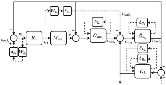 where , , and represent the nominal transfer functions of their corresponding transfer functions, and is the LFT operator. The same transfer functions can be obtained for the parameters of the second inverter.