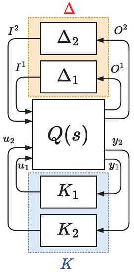 - While the connections corresponding to the controller and the uncertainty matrix are left open, the controller is designed by using the D-K iteration algorithm in such a way that the following Laplace-domain robust criterion holds:where is the transfer function of the entire system including only the inputs and outputs related to and .