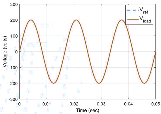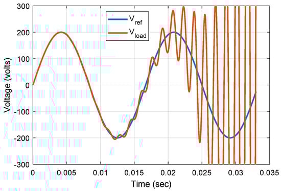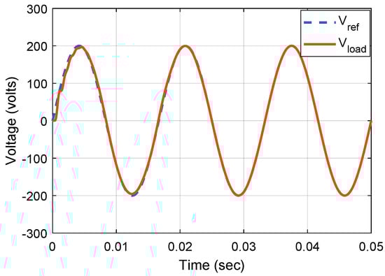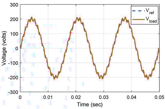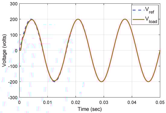 - The first case study was for the distance of 1 (km). Figure 11 and Figure 12 demonstrate the time response of the load and reference voltages for the sequentially and independently-designed controllers, respectively. Both controllers had acceptable performances in tracking the reference voltage when the distance between the inverters was 1 (km).