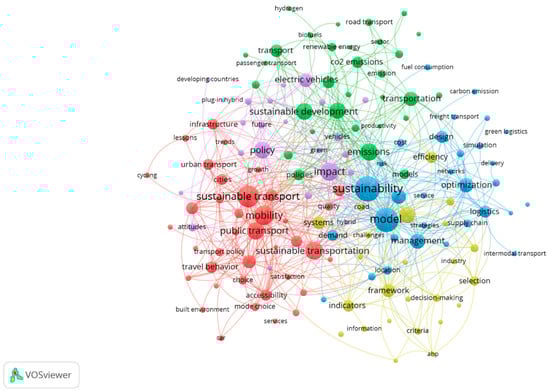 Co-word analysis identified five research clusters related to the theme of sustainable transport: Cluster 1 (red)—sustainable urban/public transport and mobility; Cluster 2 (green)—transport emissions and fuels; Cluster 3 (blue)—sustainable supply chain/logistics management models; Cluster 4 (yellow)—performance and metrics in sustainable transport; and Cluster 5 (purple)—future and policy.