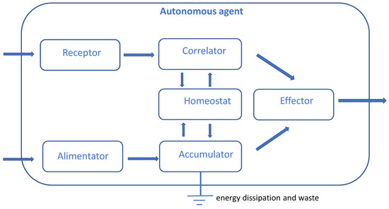 • The model on which the control is based. The self-control of an autonomous system is based on the knowledge that is created and stored in the correlator. Since the control has to be performed in advance according to the inertia of each embodied system, the models of the environment, the inner and outer processes, as well as the relationships among them, are crucial parts of the correlator. The simplest models are used for creating direct relationships between the types of stimulus reactions and are implemented as a functional dependence. In engineering, automatic control and regulation are based on such models. The most complex models, which are based on symbolic representations that can be completely detached from actual circumstances, enable anticipatory planning, which is an important possibility in the context of the aforementioned system inertia. Furthermore, the complex, abstract models enable the system to work out complex strategies that allow the system to optimize its actions. In general, the more complex and abstract the model, the higher the level of controllability because the type of control is less fixed and, as a consequence, new combinations of actions and reactions can be created as a basis for new strategies. It should be stressed that studies concerning the types of models and their complexities, which are the basis of control in cybernetic systems, are conducted in the context of biological cybernetics and the application of biological mechanisms to technology—see [55,56], chapter 10.