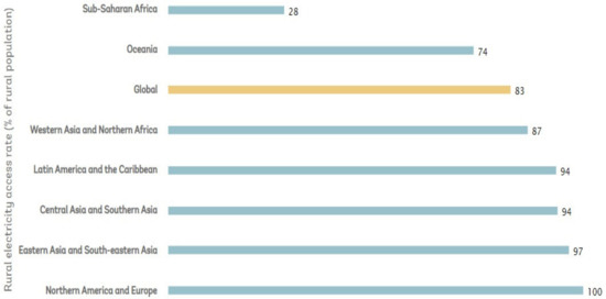 Access to electricity for rural (% of rural population) populations by the year 2020—adapted with permission from [1,7]. © 2022 The World Bank Group, IEA.