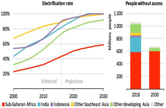 Electricity access rate and population without electricity by region under the IEA’s central scenario up to 2030–Adapted with the permission from [1]. ©2022, IEA.