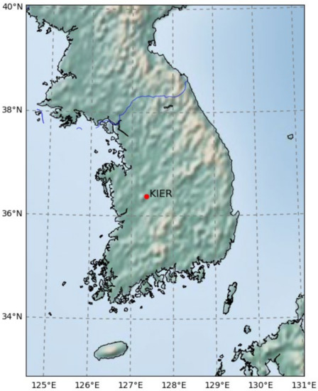 In this study, the UASIBS-KIER satellite model [11] was used to derive solar irradiance in Daejeon, South Korea. The UASIBS-KIER model was modified from the UASIBS model [10] for the Korean Peninsula, as shown in Figure 1. The UASIBS-KIER model has been implemented with various satellite imagery, resulting in different time-series product time resolutions [28]. Despite the long temporal coverage of solar irradiance time series (up to 23 years of historical data) [6], the requirements of site-adaptation processes for coincidence quality-controlled ground measurement data limit the time period that can be used. In this study, we used data from 2014 to 2019 where the UASIBS-KIER model used the COMS Level-1B data observed by the Meteorological Imager onboard the COMS satellite over the Korean Peninsula with 15-min temporal resolution.