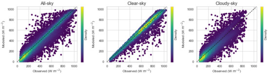 As evident from Figure 3 and Figure 4, the UASIBS-KIER model exhibited better performance under clear-sky conditions in comparison to cloudy-sky conditions. These results can be attributed to the difficulties involved in estimating the optical properties of clouds in the atmosphere because it is a major attenuating factor of the solar irradiance received on the ground surface. For DNI, the failure in detecting clouds was immediately reflected in large discrepancies between the satellite-modeled and observed values. Meanwhile, for GHI, a fraction of the solar irradiance consists of diffuse components, leading to less severe discrepancies.