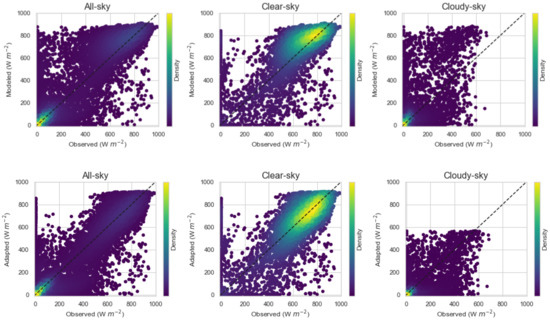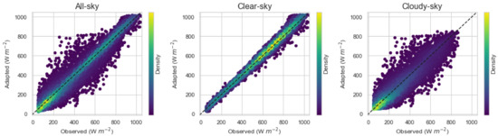 Before the site-adaptation process, the dataset was separated into two groups based on the sky conditions, i.e., clear and cloudy skies. The clear-sky condition was determined based on the value of the observed clear-sky index, , where indicated a clear sky. The satellite model outputs for both GHI and DNI, which were separated into clear and cloudy skies, exhibited different statistical metrics, as shown in Figure 3 and Figure 4, respectively.