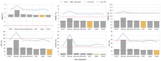 To facilitate the comprehension of sensitivity analysis of distribution mapping techniques, a combination of bar and line plot showing the statistical metrics of each case is illustrated in Figure 5, Figure 6, Figure 7 and Figure 8. The red dashed line, black dotted line, and the blue solid line represent the initial state, results of the MLR method, and individual distribution mapping techniques, respectively; the bar columns represent sequential methods, with the best sequential method (not essentially the best overall method) highlighted in orange.