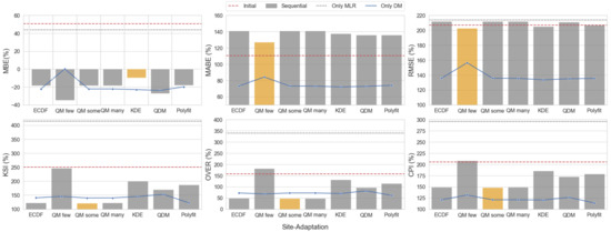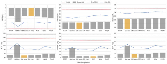 A sequential site-adaptation procedure using MLR, followed by a distribution mapping technique, was proposed and demonstrated in [22,23]. While it successfully improved the statistical metrics, it was only employed for the QM method. Therefore, we expanded it by performing a sensitivity test on the sequential site-adaptation procedure for various distribution-mapping techniques.