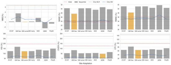 In the case of DNI, the sequential method resulted in worse metrics in comparison to individual distribution mapping techniques, as described by the overall ranking. Figure 7 and Figure 8 show the results for the clear- and cloudy-sky conditions, respectively. In contrast to the case of GHI, the sequential method was not better than the individual methods in site adaptation for DNI under clear- and cloudy-sky conditions. The individual distribution mapping technique generally performed better in almost all error statistics, particularly MBE, KSI, and OVER. The values of KSI and OVER in the LIN method were similar to those in the initial state but worse in the POLY and MLR methods. Therefore, sequential methods that utilize the MLR method as the first method do not perform well; accordingly, we can conclude that the performance of sequential methods is directly related to the regressive method used in the procedure, which was limited to the MLR method in our study.
