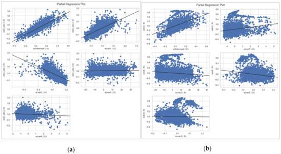 We extended regression analysis by comparing the partial regression plot for each variable in the case of GHI and DNI, as shown in Figure 9. The underlying concept can be traced back to the Frisch−Waugh−Lovell theorem, where the main goal is to reduce the multivariate regression to univariate regression [39,40]. In multivariate regression, individual plots between the response variable versus each predictor variable are not the best way for assessing the effect of each predictor variable on the response variable because it omits the possible correlation among the predictor variables. The partial regression plot helps in determining the correlation between the response variable and -th predictor variable (), conditional on other independent variables, and denoted by . The x-axis of the partial regression plot is the residual of regressing on , whereas the y-axis is the residual of regressing the response variable on .