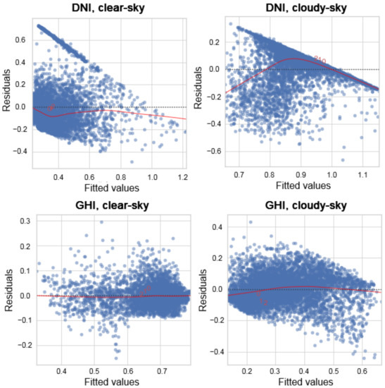 In addition, residual plots (Figure 10) were produced to visually check the nonlinearity of data, from which we can derive what has not yet been accounted for in our model. In the case of GHI, the residual plots exhibited a relatively normal distribution with linearity, as indicated by the roughly horizontal red line. However, in the case of DNI, an abnormal pattern was observed, which may indicate a curvilinear dataset or non-constant variance. Correction for this case may include transforming the response variable to make the variance constant or fitting a more general model instead of a linear model. Further analysis using partial residual plots is required to determine the appropriate transformation.