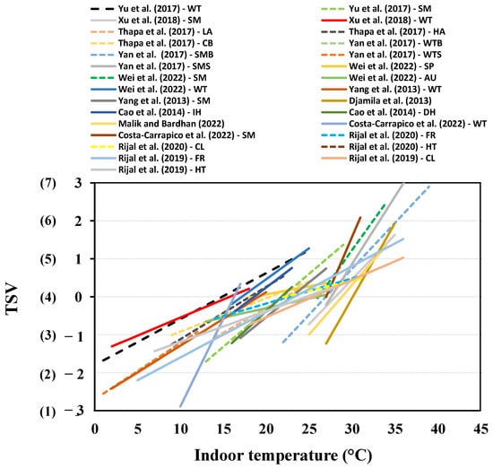 | Cao et al. [76] | Apartments | HT | IH DH | TSV = 0.172Tin − 3.2 TSV = 0.211Tin − 4.6 | 0.81 0.88 | - - | 5.8 4.7 | 16–23 16–23 | −3 to +3 |