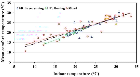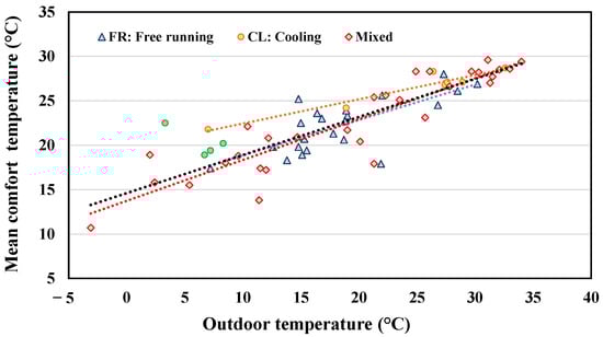 - The comfort temperature can be estimated from indoor or outdoor temperature. Thus, ‘comfort threads’ can be used as a visualization to show the observation of how comfort temperature is diverse in residential buildings according to different indoor and outdoor air temperatures. It provided observation of the slope’s differences, which can be related to building design and thermal responses. ‘Comfort threads’ also suggest that the occupants in a residential building could adapt to diverse outdoor conditions more in FR and mixed mode rather than in CL.