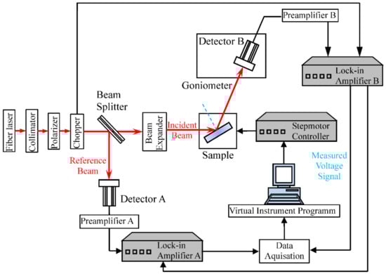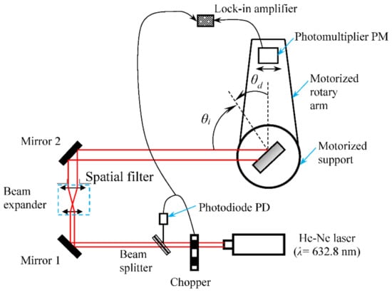 By contrast, lasers can only emit light of a single wavelength, which needs to be modulated by a chopper and detected by lock-in amplifier and photodetector. In 2006 [], the Laboratory of Molecular and Macroscopic Energy of the Central Institute of Technology measured the bi-directional transmission/reflection signals of mullite with the experimental system shown in Figure 2. This experimental system took the He-Ne laser at 632.8 nm as the light source with a diameter of 8 mm by beam expansion, modulated by a chopper and detected by lock-in amplifier and photodetector, while the directions of sample and detection device were controlled by the rotating mechanism. In 2013 [], Zhang et al. from the Harbin Institute of Technology measured the bi-directional reflection intensity distribution (BRDF) of copper foams by the experimental system shown in Figure 3, which took the He-Ne laser at 660 nm after beam expansion as the light source. The reliability of this system was verified by a single silicon wafer.