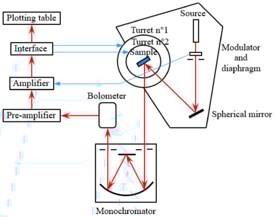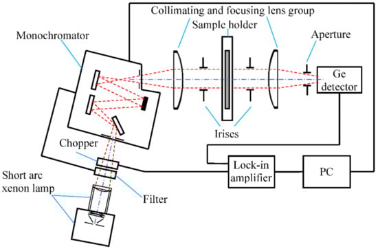 Although the light emitted by the grating monochromator is of multiple independent wavelengths, it can realize automatic scanning in a certain wide band range, so it can also be used to build the experimental bench for measuring the direction-hemispherical spectral radiation characteristics. In 2013 [], the School of Mechanical Engineering in the University of Minnesota, in cooperation with the Institute for High Temperatures of the Russian Academy of Sciences, built the direction-hemispherical transmission measurement system based on a grating monochromator, as shown in Figure 8, and used it to measure the direction-hemispherical transmission spectra of cerium dioxide ceramic materials in the wavelength range of 0.35~2 μm. In 2016 [], Coray et al. built a direction-hemispherical transmission/reflection spectra measurement system based on a grating monochromator, and obtained the spectral reflection signals of silver-coated glass and the spectral transmission signals of thin film materials, such as ETFE, in the wavelength range of 0.3~2.5 μm under the assumption of uniform distribution of incident radiation with incident solid angle.
