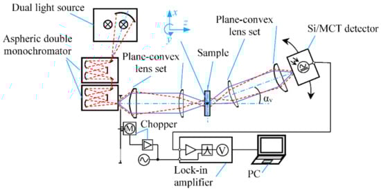 The grating monochromator separates the composite beam entering its incident slit into monochromatic light in a wide spectral range by the diffraction effect of grating, and can be automatically scanned by computer control, which is equivalent to a light source system integrated with multiple lasers, and has been widely used. Considering that the light emitted by the grating monochromator is not modulated, it is necessary to equip the chopper and lock-in amplifier in the actual construction of the measurement system. In 2002 [], the Laboratory of Applied Theoretical Mechanics and Energy of the Advanced Institute of Engineering Science and Technology of Nanci built a bi-directional transmission/reflection spectra measurement system similar to Figure 1 based on the monochromator, as shown in Figure 4, which adopted the double rotary table mechanism to control the position of the sample and the detection device, and was applied to fiber materials. In 2011 [], Coray et al. from the Solar Technology Laboratory of Paul Scherrer Institute in Switzerland proposed the experimental system shown in Figure 5 to measure the bi-directional transmission/reflection spectra of semitransparent media in the wavelength range of 0.3–4 μm, which took the grating monochromator as the light source and added a rotating device to the detection system to realize multi-angle measurement, and then Marti [] et al. used this spectroscopic goniometry system to measure the radiative property of SiC particle suspensions. This system was improved in 2016 [] with the wavelength range from 0.3 to 2.5 μm. In addition, the School of Mechanical Engineering in the University of Minnesota [,] built a bi-directional transmission measurement system based on the grating monochromator as the light source, as shown in Figure 6, while the irises on both sides of the sample could be used to limit the incoming and outgoing beam diameters. The measurement object of this study was cerium dioxide ceramic material, as the measurement wavelength range was 0.35~2 μm, the incident radiation cone angle was about 4.2° ± 0.3° and the outgoing radiation cone angle was about 6° ± 0.5°, however, the influence of these cone angles on the measurement results was not analyzed in the subsequent study.