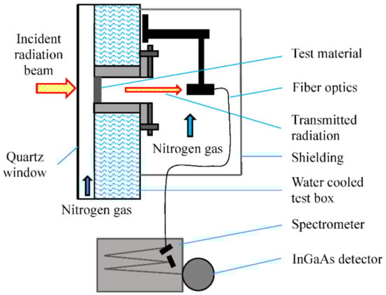 Among the published studies, the high temperature normal-hemispherical reflectance measurement system was proposed in 2001 [] by the Institute for High Temperatures of the Russian Academy of Sciences, as shown in Figure 9. The system used a 10.6 μm CO2 laser as the radiation heating source and performed real-time temperature measurements through a radiation pyrometer in the temperature range from room temperature to 3200 K. At the same time, the normal-hemispherical reflectance spectra of zirconia ceramic materials were obtained using the laser at 0.488 μm, 0.6328 μm, 1.15 μm and 1.39 μm wavelengths as the incident light sources. However, the material used for the integrating sphere was not explained and the temperature field inside the integrating sphere was not analyzed specifically. Then, Zhang [] et al. at the Harbin Institute of Technology built an integrating-sphere reflectometry to measure the spectral reflectivity, which could be used to calculate the spectral emissivity based on Kirchhoff’s Law; the schematic diagram is drawn in Figure 10. In addition, White [] from the AmU Research Center of NASA established the experimental system to measure normal transmission spectra based on solar radiation in 2010, as shown in Figure 11, which took a fiber optic spectrometer as the detection device in the visible and near-infrared bands. The sample was porous fiber material in this study, but the measurement temperature was not indicated.