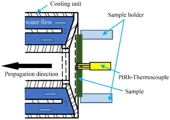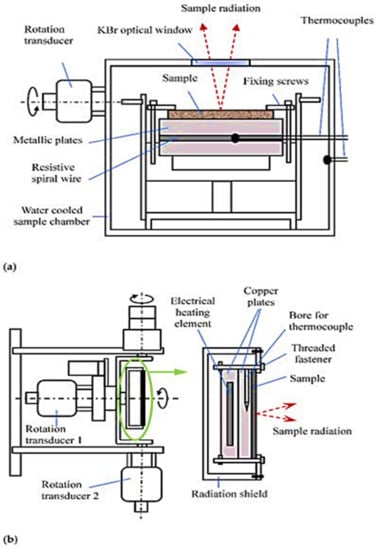 Electric heating [], as the most common heating method, usually places the sample in a cylindrical heating chamber and heats it on one side, as shown in Figure 12. Electric heating belongs to a contact heating mode based on heat conduction from the metal plate attached behind the sample, but the temperature is limited by the electric power. For the system shown in Figure 13a, the surface temperature of the sample could reach 770 °C and the entire system was set in the stainless-steel cavity with water cooling and internal blackening under the condition of atmosphere or vacuum. The system in Figure 13b is a similar contact electric heating system. Considering that this kind of heating method adopts one-sided heating, better thermal conductivity of the sample is usually needed, otherwise a large temperature gradient will be generated in the axial direction, which will affect the emission signal measurement of thermal insulation materials.