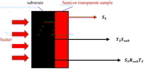 As absorbing and scattering semitransparent materials are semitransparent media, the radiation signal of the heating element will interfere with measurement results. Based on this, the Korea Institute of Standards Science and Technology proposed the double substrate method from 2010 to 2013 [,,], whose principle is shown in Figure 14. Two materials with different emissivity were used as substrates in the measurement, and the actual emissivity of the sample was solved though analyzing the relationship between the measured signal, the base signal and the signal of the sample to be measured. In this study, the sample was heated by thermal conduction of the substrate, while gold and black paint were used as the substrate materials, and the radiation signal was detected by an FTIR spectrometer in the wavelength range of 2.5~25 μm up to 1200 °C. To ensure good contact between the sample and the substrate, the sample was polished in this study, including sapphire and Al2O3 ceramics.
