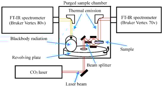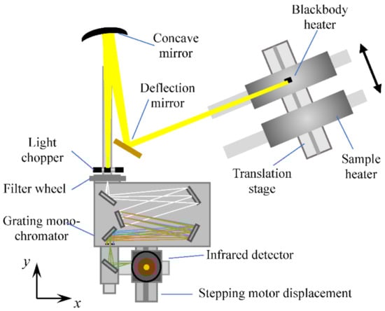 Different from the transmission/reflection measurement, the emission measurement cannot adopt external light source, as the sample itself is the radiation source. Since the measured signal cannot be modulated in advance, the source and influence of various stray radiation signals should be fully considered in the actual measurement results to obtain accurate emission signals of samples. Sample heating is a key part of emission measurement, and heating methods currently developed mainly include the following: electric heating, high-temperature furnace heating, laser heating, xenon lamp heating, flame heating [] and so on. Considering the upper limit of temperature of electric heating is low, as it is affected by power, the flame heating may pollute the sample, as it needs to contact the sample, and the working temperature of furnace heating is also limited by the material of heating rod, by contrast, the radiation heating method based on laser or xenon lamp is the best choice for carrying out high temperature emission measurements of absorbing and scattering semitransparent materials because of wider temperature range, more exploitability, and cleaner heating environment.