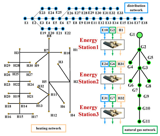 The structure diagram of IEDS is shown in Figure 2, including the modified 11-node natural gas network [23], the modified IEEE 33-node distribution network [33], the modified 32-node heating network [35], and three energy stations. The No. 1 energy station is coupled with No. 10 (E10) of the distribution network, No. 2 (G2) of the natural gas network, and No. 1 (H1) of the heating network. The No. 2 energy station is coupled with No. 24 node (E24) of the distribution network, No. 6 node (G6) of the natural gas network, and No. 31 node (H31) of the heating network. The No. 3 energy station is coupled with No. 31 node (E31) of the distribution network, No. 7 node (G7) of the natural gas network, and No. 32 node (H32) of the heating network. The detailed parameters of NGN, DN, and HN are provided in [23,33,35,36].