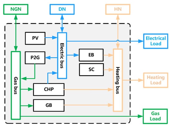 Potential solutions can be adopted to improve the distributed renewable energy sources hosting capacity through MG to realize the integration and coordination of distributed generators, distributed storage systems, and controllable loads [4,5,6]. Based on ADN, the network reconfiguration, the power factor control strategy, the reactive power compensation devices, the flexible interconnection technology, etc., can be used to improve the distributed renewable energy sources hosting capacity [7,8,9,10,11]. As the integration and coordination of a multi-energy system can realize optimal utilization of multiple types of energies, for example, electricity, heat, and gas, and can provide a “buffer” to accommodate more distributed renewable energy, IEDS has been considered to be able to provide more effective ways to enhance the distributed renewable energy sources hosting capacity [12,13,14,15].