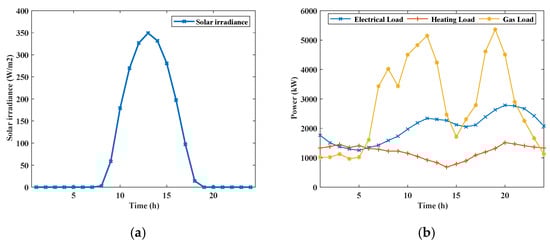 The assumptions on operation conditions of the integrated energy distribution system [2,33,35,37] are as follows: The maximum installation area of PV and SC at each energy station is 15,000 m2. The predicted value of irradiance intensity is taken as 700 W/m2 [37]. The maximum allowable branch current is 250 A. The allowable range of the DN voltage is 0.9–1.1 p.u. and the allowable pressure of the NGN is 35–75 mbar. We assume that the maximum acceptable water velocity in pipelines is 2 m/s, the temperature difference between water at the inlet and outlet of the pipe is 25 °C, and the heat loss ratio per unit length is 0.15/km. The predefined precision with regard to the SOCP relaxation deviation of the DN and the NGN are set to 1 × 10−6 and 1 × 10−2, respectively. The GCV of natural gas is 41.04 MJ/m3.