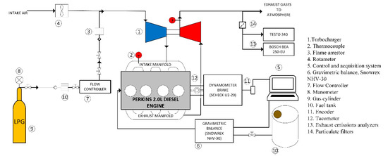 In this investigation, a Perkins Prima M80T Turbocharged marine diesel engine (Specifications in Table 1) was used to dual-operate with LPG-diesel. To regulate the load level of the engine, a 150-kW hydraulic dynamometer was used coupled to the engine, which can be seen in the experimental setup of Figure 1 and physically in Figure 2. The dynamometer has an analog indicator engine torque, which is regulated by a lever system. Regarding fuels, low-sulfur commercial diesel was used. The LPG was supplied by a 45 kg cylinder with an internal pressure of 100 psi. The way to control the flow of LPG was through a pressure regulator maintaining an outlet pressure between 0.1 and 2.0 bar. To measure the amount of LPG, an Aalborg GFC-57 mass flow controller was used, integrated into the injection line to the engine towards the air intake.