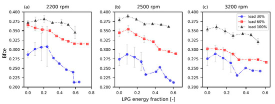 According to Figure 4, the brake fuel conversion efficiency decreases for an operation at low loads. For both 30% and 60% engine load, there is a decrease of 16% in brake fuel conversion efficiency as the energy fraction of LPG is increased. This is because for larger fractions of LPG, the amount of pilot fuel decreases, and the greater amount of diesel, the better and stronger the ignition leading to better combustion [2,18,19,20]. For a full load operation, it is increased up to a certain fraction of LPG. At 2200 rpm, brake fuel conversion efficiency increases from 37.2% to 38.1% (which means a 2.6% increase) for a 20% substitution. Similarly, for a speed of 2500 rpm, there is an increase from 37.9% to 38.9% (which means an increase of 2.6%) for substitution of 10%, and finally, for a speed of 3200 rpm, there is an increase from 35.4% to 36.0%, (which means a 1.7% increase) for a 10% replacement of diesel with LPG. In addition, it should be noted that the highest brake fuel conversion efficiency was obtained for a speed of 2500 rpm for small and larger LPG fractions. For a 60% fraction of LPG, brake fuel conversion efficiency drops dramatically when knock occurs for an operation with a speed of 2200 and 3200 rpm, however, for a speed of 2500 rpm, there is a decrease in brake fuel conversion efficiency, but it is not as evident as the other cases. That is also explained by the instability during the engine operation [26].