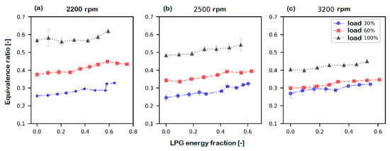 Equivalence ratio v/s LPG energy fraction at (a) 2200 rpm, (b) 2500 rpm, and (c) 3200 rpm.