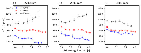 NOx emissions v/s LPG energy fraction at (a) 2200 rpm, (b) 2500 rpm, and (c) 3200 rpm.