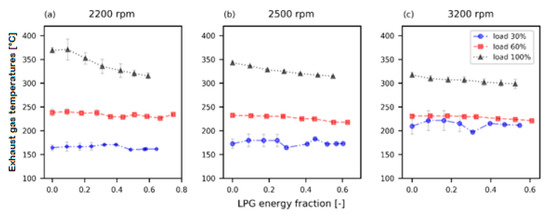The NOx emissions, shown in Figure 9, show a decrease in these emissions for low loads as the percentage of LPG to the engine increases and the exhaust gas temperature decreases (Figure 10). This is due to the ignition delay that causes poor combustion and a low combustion temperature for those charge levels [1,2,12,16,18]. For maximum LPG substitutions, it is possible to reduce, on average, by 34%. However, for high loads, except for the graph of Figure 9c, these emissions increase. For maximum brake fuel conversion efficiency, a boost for NOx of 1.7% is recorded for a speed of 2200 rpm and a decrease of 4.6% and 4.7% at 2500 rpm and 3200 rpm, respectively. At full load, NOx emissions increases while exhaust gas temperature decreases for operation with higher LPG fractions at 2200 and 2500 rpm. That is explained by the equivalence ratio used, considering that it is greater than the 30% and 60% load (Figure 6).