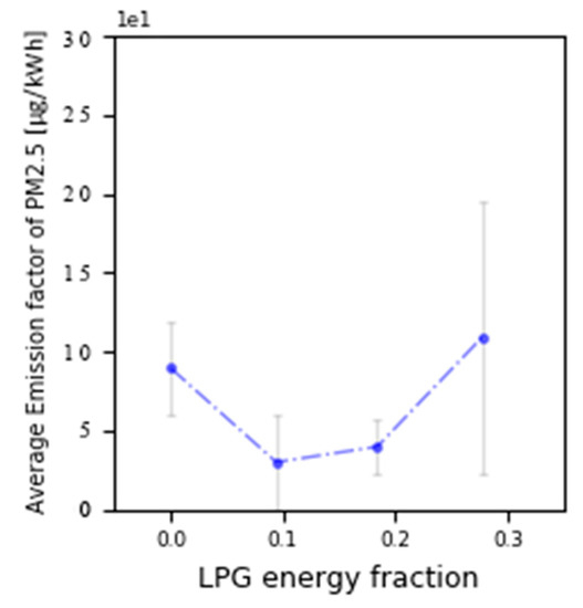 Regarding the second phase, the LPG energy fraction, emission factors of PM2.5, standard deviation (SD) and Pearson variation coefficient (VC) are found in Table 5. The VC indicates the variation of a sample independent of its magnitude. When this value is close to zero, it indicates a homogeneous sample, but if it is close to one, it indicates a heterogeneous sample. Given this definition, it can be concluded that although each percentage of GLP was repeated three times, the sample is homogeneous for all the LPG fractions. The emission factor data is plotted in Figure 11 for better visualization.