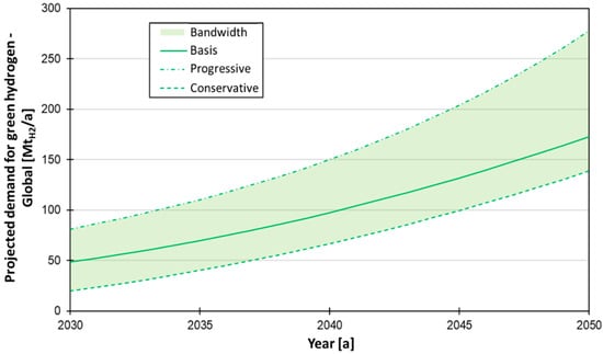 Forecasted development of global green hydrogen demand. Values are based on an evaluation of [6,7,8,9].