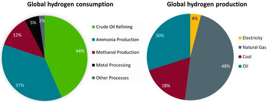 Shares of global hydrogen consumption and production. Left: share of the most important applications in modern global hydrogen consumption [6]; right: share of primary energy sources used for modern global hydrogen production [9].