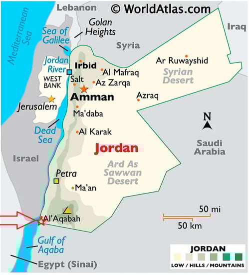 - World Atlas, Maps of Jordan. Available online: https://www.worldatlas.com/maps/jordan, (accessed on 26 November 2022).