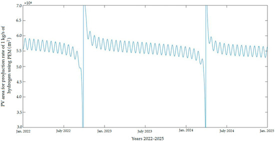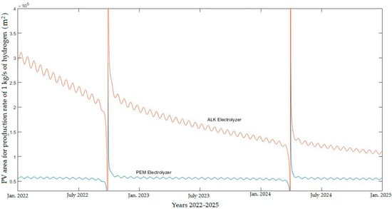 The area of the PV system is the best variable to represent the PV system capacity. The developed code was used to predict the required area for the PV system during the improvement and development of electrolyzer technologies in the considered period. In addition, the model was used to predict the total investment cost, with respect to both electrolyzers.