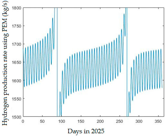 The potential for producing a fixed amount of green hydrogen depends on the power production from the PV system, which varies with the time of year. The capacity of the PV system should thus vary, according to the time of year. In a real case, it is impossible to change this capacity. Thus, this model can be used to predict the needed area for PV during the development and improvement of the performance of the electrolyzer, in order to provide a more efficient technology during the period until 2025. This model applies to forecasting the yearly production of hydrogen based on a fixed capacity of the PV system.