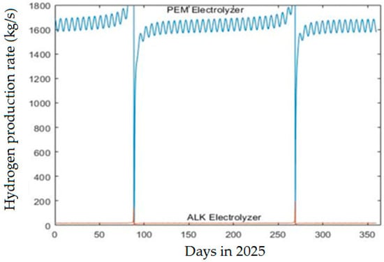 There are three main types of electrolysis: alkaline water electrolysis (ALK), polymer electrolyte membrane electrolysis (PEM), and solid oxide electrolysis (SOEL) [32]. Regardless of the process, the principle of water electrolysis is identical. We compared the behavior of ALK and PEM on the decision variables. The development models of these technologies during the study period are detailed in Table 2.