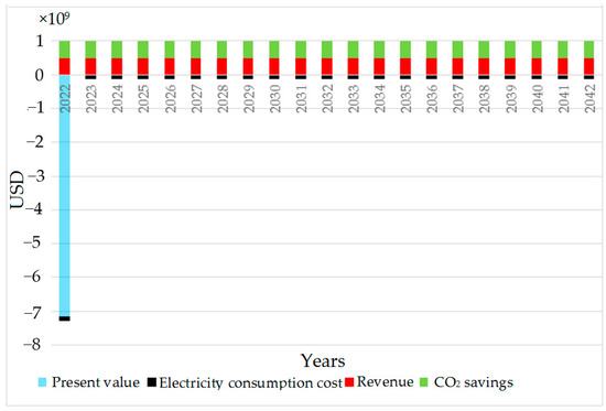 In Jordan, many non-renewable energy sources are used to feed electric power plants, such as natural gas, diesel, and heavy fuel oil. In the first scenario, grid electricity was used to feed the hydrogen power plant, and the power consumption of the electrolyzer and the compressor were evaluated in the model. Then, the annual operation cost (USD/year) for this alternative was calculated by applying Equation (10), based on the electricity tariff in Jordan (0.21 USD/kWh) [39]: