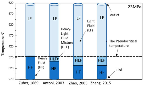 Recently, flow instability has gained massive attention from researchers since large magnitudes and continuous flow fluctuations can cause mechanical vibrations, disrupt control systems, and cause operational issues. Therefore, flow instabilities are widely studied experimentally [10,11,12,13] as well as numerically [14,15,16,17,18,19]. The discussion reveals that the real dynamics of the above-discussed systems are complex and complicated. Hence, considerable computational and human efforts are required to study the system’s complete stability characteristics (linear and non-linear). The above discussion shows that in several fluid flow systems, mainly solar thermal and nuclear reactors, heated channels capture and maximize the heat transfer. However, channel-to-channel interaction, flow, and heat distribution also complicate the real dynamics of these systems. This necessitates the development of reduced-order models (ROMs), which can deliver qualitative features of complex dynamics while keeping computational effort and complexity at a reasonable level [20,21,22]. Therefore, to replicate the real dynamics, several researchers adopted a reduced-order modeling approach along with appropriate approximation functions and, as a geometry reduction, single heated channels and configurations with a few parallel channel’s geometries have been studied. In this context, Zuber [23] first demonstrated the flow instability characteristics of a supercritical pressure system through single heated channel geometry. They used analogous formulations and assumptions which are commonly used in two-phase flow systems. They considered density as a function of enthalpy and divided the heated channel into two fluid regions as liquid-like (light fluid) and gas-like (heavy or supercritical fluid). In order to maintain continuity, they used equations of state such as van der Waals or fact gas equation. Later, Antoni [24] introduced a two-phase or heavy–light fluid mixture region to capture the fluid behavior more accurately near the pseudocritical temperature and significantly improve the two-node model. In this context, Zhao [9] also proposed a new model by using IAPWS-IF 97 region data in a pressure–temperature plane to divide a single heated channel into three regions, as shown in Figure 1; heavy fluid (HF), mixture fluid (light and heavy fluid; HLF), and light fluid (LF) based on temperature calculation. The simulation carried out using this approach shows the DWOs and Ledinegg instability. Zhang et al. [25] extended this study and stated that the partition method based on the temperature is unsuitable as fluid property behavior changes with the system pressure. Therefore, to study the DWO phenomena of SCFs (water) in a heated channel, he proposed a new partition method using a specific value of the coefficient of volume expansion by dividing the heated channel into three regions. However, they have not reported the occurrence of Ledinegg instability in their system. In this continuation, several authors also used the n-node nodalization scheme based on the different interpretation of equation of states to divide the heated channel into n-number of nodes [26,27,28,29,30].