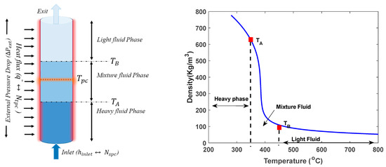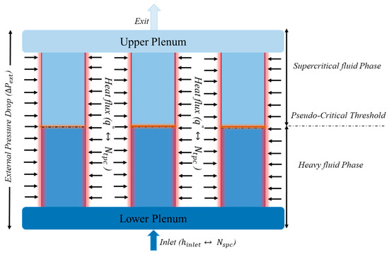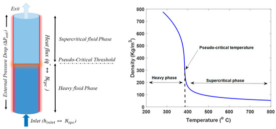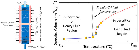 Energy demand has been rapidly increasing with population, industrialization, and urbanization demands. Therefore, green and renewable energy is being adopted on a large scale. However, safety and high efficiency are a big hurdle for mass utilization of several energy systems such as biomass, geothermal and nuclear energy. Therefore, research has repeatedly recognized the potential of supercritical fluids to operate energy systems at high temperatures and system pressures. Saeed [1,2,3] carried out a detailed analysis on the geometrical design and optimization of thermal–hydraulic performance of a supercritical Brayton cycle. They studied different components and proposed straight and zigzag channel systems to significantly improve the overall thermal hydraulic performance. Moreover, the supercritical fluid (SCF) is adopted as a working fluid in advanced generation VI supercritical nuclear reactors [4]. Although SCF undergoes no phase change, it exhibits drastic changes in fluid properties (sharp downfall and peaks) near the pseudocritical temperature. Such drastic variations in fluid properties cause flow instabilities and sudden changes in operating conditions [5,6,7,8,9].