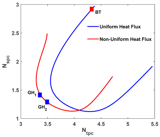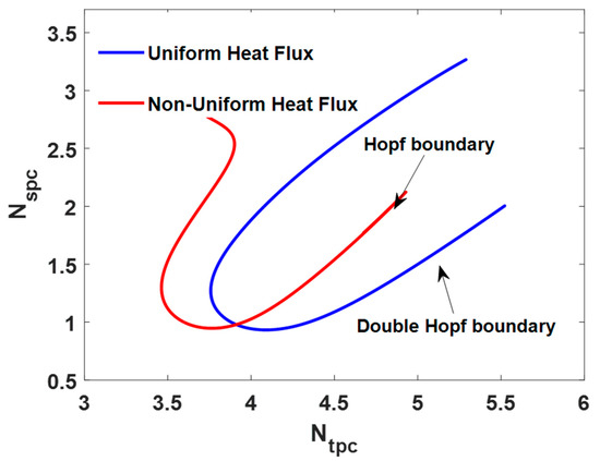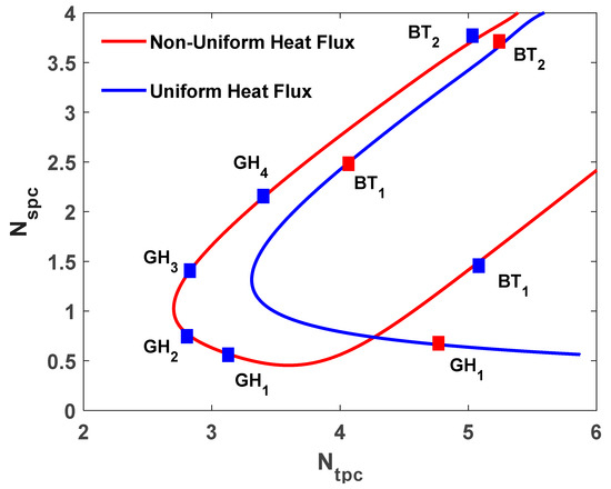 It has been observed from Figure 6 that, under uniform heat flux conditions, no GH point is observed. However, under non-uniform heat flux, systems are more critical and non-linear. Therefore, two GH points have been observed. This phenomenon confirms that under uniform heat flux, complete dynamics are supercritical, although it changes from supercritical to subcritical or vice versa once under non-uniform heat flux. Moreover, as an interaction between dynamic and static instability, one Bogdanov–Takens (BT) bifurcation point has been observed under high uniform heat flux conditions. At the high subcooling number, Ledinegg instability has been observed; similar phenomena have also been observed in other research [26,41].
