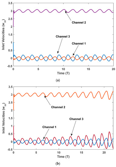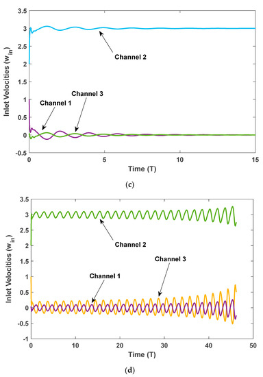 Using the abovementioned BCs along with Equations (15) and (16) to represent the final equation for the inlet velocity of the fluid of each channel as