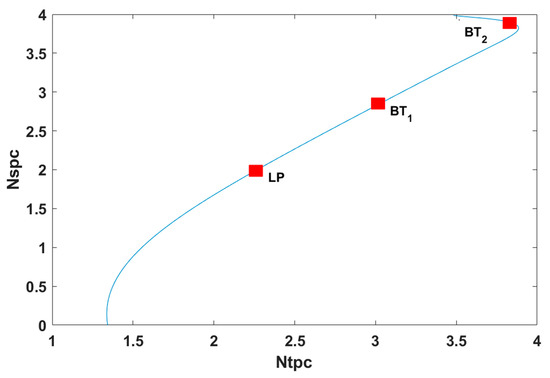The Bogdanov–Takens (BT) bifurcation point has also been detected in the system as shown in Figure 11. According to the bifurcation theory [47,48], this is a co-dimension two bifurcation that is associated to static instability. This is characterized by the existence of two complex eigenvalues with opposite signs and the same real parts. Therefore, the system experiences a sudden jump from one equilibrium to another equilibrium, where the nature of equilibrium could vary between stable and unstable. The limit point (LP) is also another type of bifurcation point found in the system. It is also a co-dimension two bifurcation, which appears in the system when it has all negative real eigenvalues. Therefore, non-oscillatory solutions have been observed at the LP boundary. More details of such non-linear phenomena can be found in the literature for different energy systems [15,47,48,49,50].