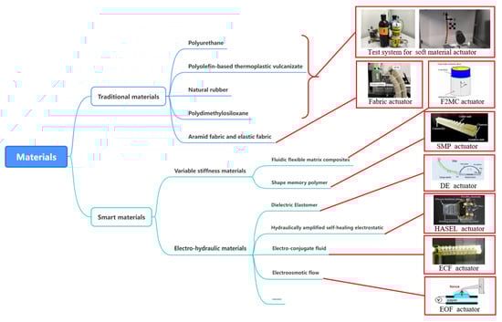 The soft actuation system’s main body and moving components are typically comprised of hyperelastic materials such as polymers, rubber, silicone, or other soft materials. Generally, these materials are created by 3D printers or molds, which allows for simple processing and affordable production. Meanwhile, their viscoelastic properties dissipate the energy of shocks and damp oscillations to eliminate discontinuous motion and forces. The proper material can make sure that the soft actuator withstands higher pressures, produces a larger output force, and can execute a variety of natural and flexible movements smoothly, as shown in Figure 2. The compliance, flexibility, and robustness of the system will be improved along with the actuation ability and efficiency of the soft actuation system as a result of ongoing research into more suitable and prospective actuation materials.