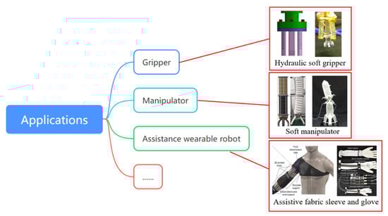 With the continuous study of hydraulic soft actuators by researchers, the inherent flexibility and compliance of hydraulic soft actuators show their great advantages over traditional rigid actuators, enabling them to better adapt to different environments and tasks. Hydraulic soft actuators are now capable of cooperating with a variety of smart materials and structures, which demonstrates the multifunctional development trend in the microstructure actuator industry in recent years. Therefore, due to its unique actuation performance, a hydraulic software actuator has good application prospects in environments that require a high load and high safety requirement, such as soft gripper, soft robotic manipulator, bionic robot, interactive robot, assistance wearable robot, and so on, as shown in Figure 3.