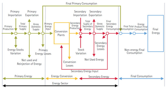 Aligned with international standards, the NEB is the result of a systemic approach that considers four parts: primary energy, energy conversion, secondary energy and final consumption, as aforementioned [20]. Figure 2 shows a schematic representation of the NEB energy flow.